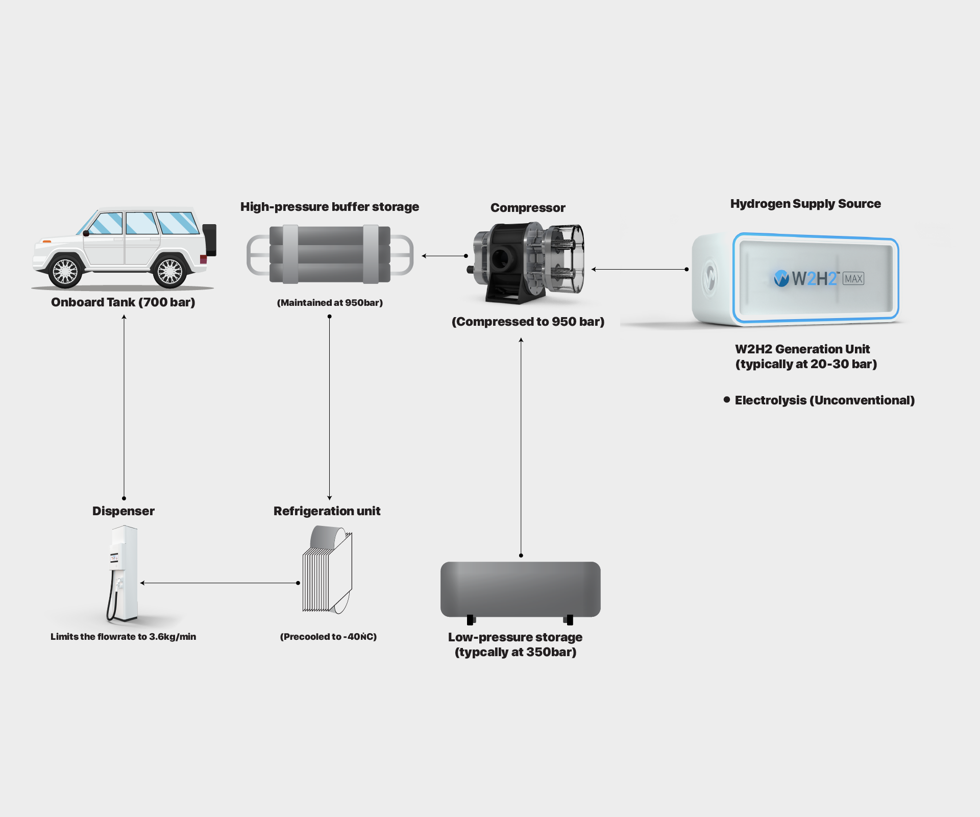 W2H2를 통해 고객은 하루에 여러 대의 차량에 연료를 공급할 수 있는 대규모 수소 생산 능력을 현장에서 구축할 수 있습니다.